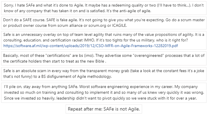 To illustrate this, let’s look at u/PhilosopherOfCS post on Reddit. u/PhilosopherOfCS asked which SAFe certification would be the best suited for them and they got 13 main responses. 2 of them recommended a SAFe certification and almost all the others explained how bad SAFe is: